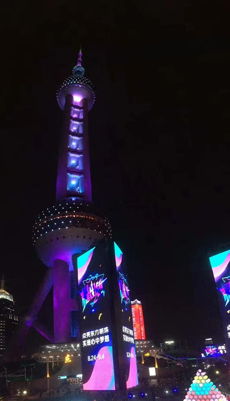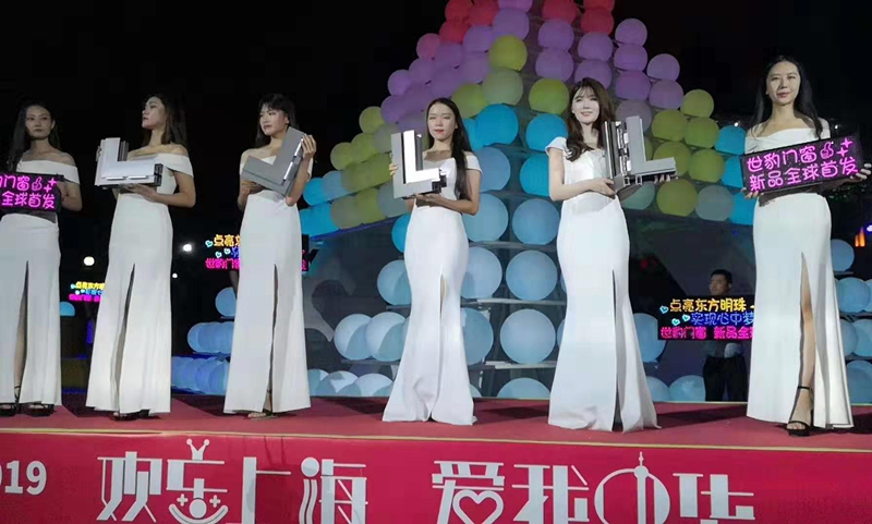 新品发布剪彩和鎏金启动仪式后,举行世豹门窗新品全球首发点亮东方明珠、实现心中梦想活动。工作人员同时下压舞台四角圆柱灯,灯柱内亮,东方明珠电视塔对应颜色照亮夜空,光彩夺目。