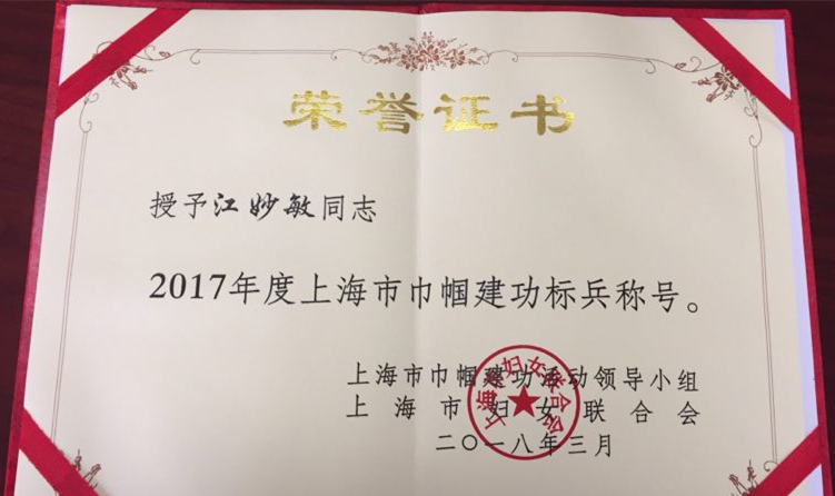 喜讯:江妙敏荣获2017年度上海市巾帼建功标兵称号 “三.八”女神节前夕,经上海市巾帼建功活动领导小组和上海市妇女联合会共同评选,我会常务副会长江妙敏荣获“2017年度上海市巾帼建功标兵”光荣称号! 这是我会企业家获得的又一殊荣,商会同仁向江会长表示热烈祝贺!