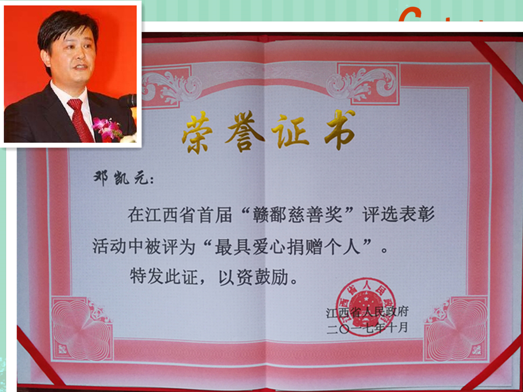 10月26日,江西省首届赣鄱慈善奖表彰大会在南昌召开,江西省人民政府向60名单位和个人颁发了奖项,我会名誉会长、赣商联合股份有限公司董事长邓凯元荣获“最具爱心捐赠个人奖”。