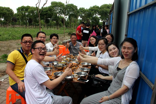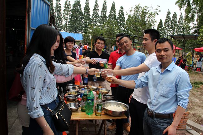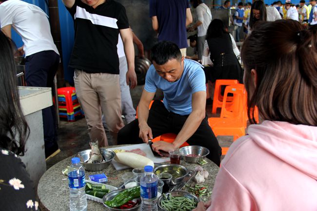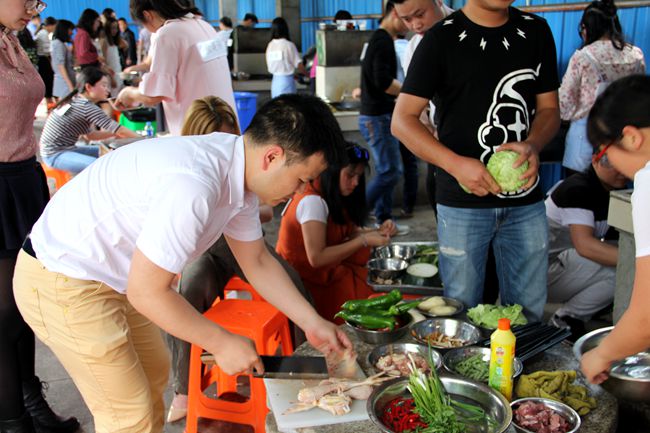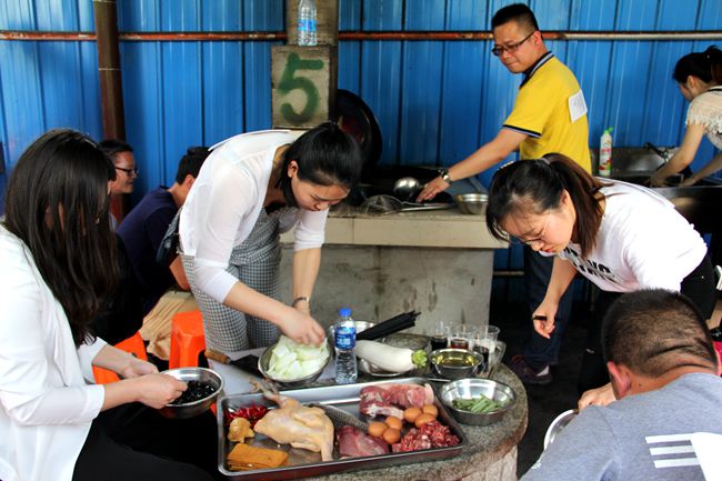魔幻厨房位于绿色园林中,灶台有露天的也有室内的。我们被安排在简易工棚内,七支队伍依次排列,自主烧火炒菜解决中餐。厨艺是未来家庭最重要的手艺,也是相互了解展示自己的好方式。大家一撸袖子干了起来。谁说现代青年被宠坏,瞧队员们个个抢着干活,饭来张口偏见为之一扫。烧火的,掌铲的,切菜的,男生抢着表现;洗菜的,打个下手,女生主动积极。很快,一桌桌色香味俱全的菜肴做成了。下筷前,主持人要求各队选一道菜肴送到了评委桌上参赛。经过评选,天霸队做的番茄烧鸡煮得熟,味道好,造型美,荣获第一。