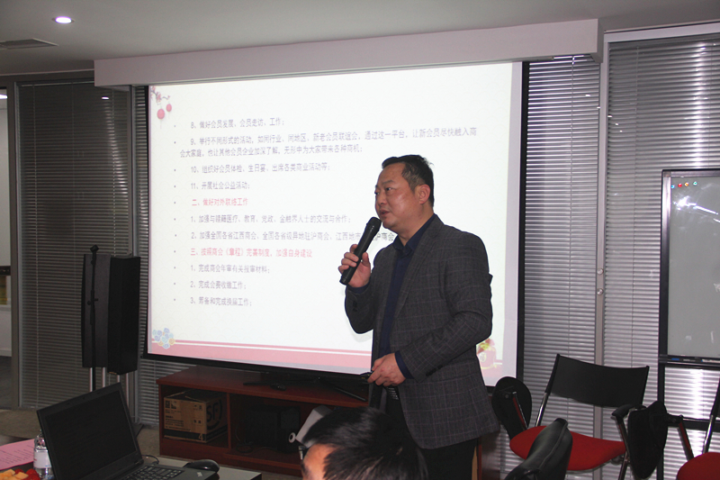 骆彬秘书长主持会议并汇报了2017年商会主要工作:在理事会正确领导和全体会员大力支持下,我会夯实服务,提升品质,拓宽平台,充分发挥桥梁纽带作用,实现了商会工作新飞跃。如成功主办了泛长三角省级江西商会联盟二届一次会议,圆满组织会员赴泰国商务考察,成功举行建军90周年文艺演出专场和第三届沪赣单身男女交友活动,牵头组织企业家参加江西省政府长三角赣商回乡投资恳谈会和首届世界赣商大会,加强银企合作,组织会员体检和项目路演,参与主办全国异地商会和行业协会秘书长浦江游轮论坛,帮扶困难企业,为江西13所学校捐赠价值3500万元智慧教育系统等等,接待了英美、厦门、宁波等地江西商会来访考察,积极参加上海市工商联、企业联合会、各省市和本省市县在沪商会活动。商会党支部、各片区、分会和会员也自行开展了一系列学习创新、联谊交流、扶贫济困活动,取得了多项荣誉和奖励。我会被省政府驻沪办授予“2016年度省驻沪单位先进集体”,荣获江西赣商联合总会颁发的2016年度信息工作先进单位。