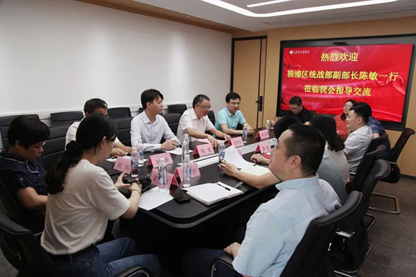8月23日,上海市杨浦区委统战部副部长陈敏,五角场街道党工委书记、人大工委主任周灵,跟岗锻炼干部、丽江市华坪县委常委、统战部部长王宁武,杨浦区区工商联副主席孙宇,五角场街道办事处副主任段志刚,杨浦区委统战部社会工作科科长许雯,杨浦区工商联经济部部长马岷海,五角场街道党政办主任顾华,杨浦区工商联干部董晓桐等莅临上海市杨浦区黄兴路2077号22楼 交流座谈。