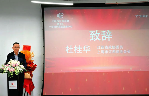 江西省政协委员、 会长杜桂华代表商会祝贺博士汇、产业创新发展促进中心的成立。他表示, 在赣沪两地各级领导的关爱与支持下,不断加强思想政治引领,引导广大民营经济人士坚定不移听党话、跟党走,自觉做爱国敬业、守法经营、创业创新、回报社会的典范,做合格的中国特色社会主义事业建设者,取得了瞩目的成绩。