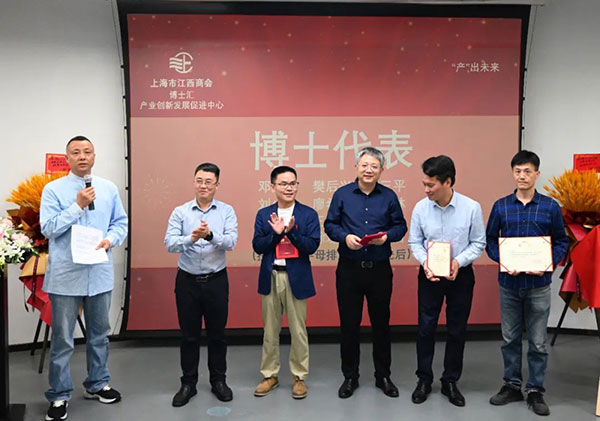 上饶市人民政府驻上海联络处副主任姬光喜为博士汇蔡晓丰、邓光辉、樊后兴、李三平颁发荣誉证书 。