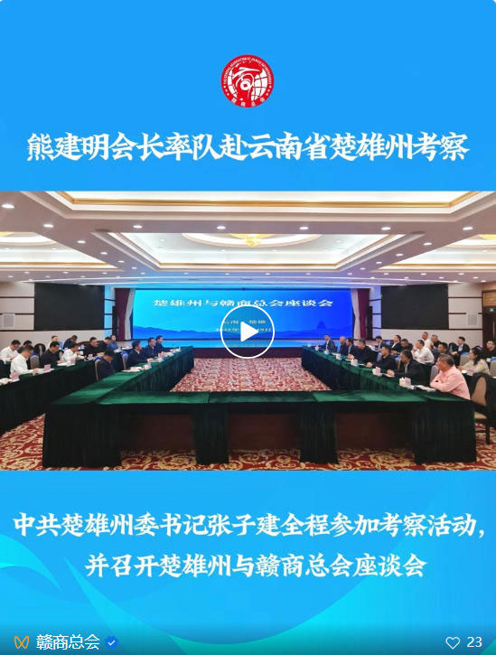 2025年10月19日,全国人大代表、赣商总会会长熊建明率队赴云南省楚雄州投资考察,中共楚雄州委书记张子建全程参加考察活动,并召开楚雄州与赣商总会座谈会。会议由中共楚雄州委副书记、州长罗景锋主持,中共楚雄州委常委、常务副州长李勇参加,副州长彭玮作了招商推介。