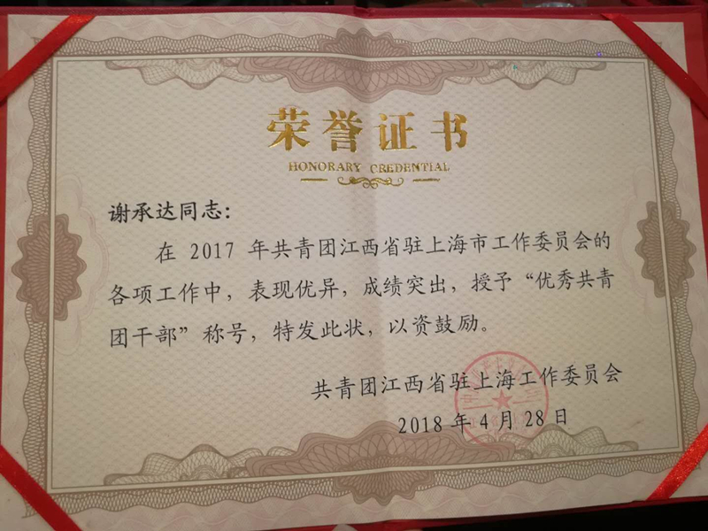 江西省驻沪团工委还对2017年优秀驻沪团组织和个人进行了表彰。南昌驻沪团工委获2017年“五四红旗团委”称号,并获此次活动“优秀组织奖”。我会副会长邓华礼、企业家谢承达荣获2017年“优秀共青团干部”称号,我会理事邓朝义公司—上海控创信息技术有限公司团支部获“五四红旗团支部”称号。