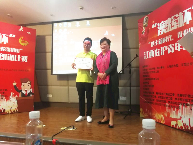 4月28日上午,由共青团江西省驻上海工作委员会主办的“澳辉杯”“携手新时代、青春颂祖国”江西在沪青年朗诵比赛在静安区曹家渡街道社区党建服务中心举行,我会常务副会长蒋以新赞助此次活动并担任决赛评委,共青团上海市委和共青团江西省委负责人出席比赛,各地市(县)驻沪团工委、各直属团支部、高校江西籍青年学子参加了比赛